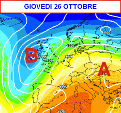 Volgendo lo sguardo a prua e arrivando a giovedì 26 ottobre, si nota l’approccio da ovest di una figura di maltempo preceduta da umidi venti di matrice meridionale (terza mappa).