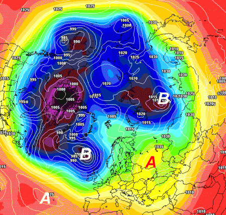 Questa sorta di muro contro le velleità atlantiche, porterebbe alla gestazione di masse d’aria progressivamente più fredde sull’est europeo e al rafforzamento dell’anticiclone stesso ad ovest. Qui sotto, nell’ipotesi del modello americano per lo stesso intervallo temporale, cioè giovedì 12 novembre, c’è l’alta pressione posizionata sulla Scandinavia e una conca depressionaria posizionata sul Mediterraneo centrale:
