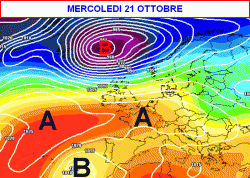 La prima cartina sinottica, valida per la giornata di mercoledì 21 ottobre, ci mostra una profonda depressione che agisce a nord della Scozia con probabili venti di tempesta.