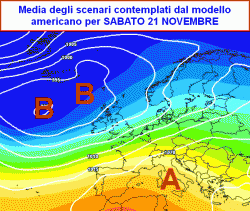 La media degli scenari contemplati dal modello americano per sabato 21 novembre (cartina in alto a sinistra), ci mostra una situazione di sostanziale equilibrio con l’alta pressione nel Mediterraneo e le basse pressioni a latitudini settentrionali.