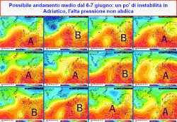 domenica 7 giugno: tempo simile, ancora instabile su medio Adriatico e meridione, qualche temporale pomeridiano anche su Friuli Venezia Giulia, Appennino emiliano-romagnolo, toscano ed umbro. Bello altrove. Sempre ventilato.