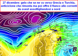 Mercoledì 27 dicembre: allontanamento della massa d’aria fredda verso Grecia e Turchia, ancora freddo ma senza più fenomeni su medio Adriatico e meridione, bello e meno freddo altrove.