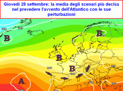venerdì 29 e sabato 30 settembre: possibile arrivo di una perturbazione atlantica da ovest con piogge e temporali a partire dal nord-ovest e dalla Toscana. Rinforzo dei venti. Sabato estensione dei fenomeni a tutto il nord e il centro, in giornata anche sulla Campania, migliora la sera sul nord-ovest. Temperature in calo nelle aree interessate da piogge.