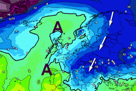 Da martedi 12 l’anticiclone andrà ad ergersi ad ovest del Continente e favorirà una progressiva discesa di correnti fredde da nord dirette contro le Alpi, che lasceranno perà sottovento e dunque in cielo sereno il nord, sotto le nubi e le nevicate dalla Romagna in giù lungo l’Adriatico e in generale a quote molto basse su tutto il sud, dove si scaverà probabilmente il classico minimo pressorio a ridosso del Mar Jonio.