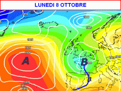 Lunedi 8 ottobre (terza mappa) il fronte sarà in bella mostra sul Mediterraneo occidentale con il suo carico di pioggia pronto ad interessare tutta l’Italia.