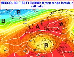 La prima mappa ci mostra la situazione attesa in Italia nella giornata di mercoledì 7 settembre. In questo frangente, la depressione responsabile del maltempo sarà centrata sulla Corsica, avviluppando nelle sue spire tutta la nostra Penisola.