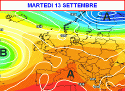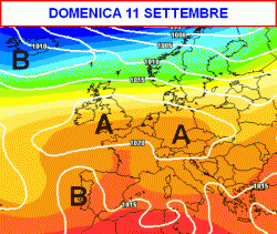 Volgendo lo sguardo a prua e arrivando alla seconda domenica di settembre, si nota una ricostituzione del tessuto anticiclonico sull’Europa centrale e sull’Italia, ma supportato da geopotenziali non elevati come quelli degli ultimi giorni.