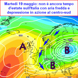 da martedì 19 a giovedì 21 maggio: tempo instabile e inaffidabile su gran parte del Paese, schiarite ma anche annuvolamenti e rischio di temporali, più probabili al centro-sud e sul nord-est, specie nel pomeriggio e sulle zone interne, migliora da giovedì al nord-ovest. Clima ventilato e fresco.