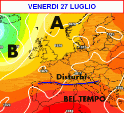 A partire da venerdì 27 luglio (seconda mappa) l’alta pressione tenderà un po’ a flettere sulle regioni settentrionali dove si attiveranno disturbi temporaleschi specie sui rilievi e nelle ore pomeridiano-serali.