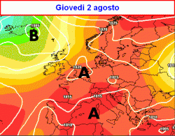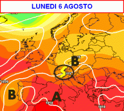 Tra domenica 5 e lunedi 6 agosto una leggera incrinatura dell’alta pressione favorirà alcuni temporali al nord e su parte del centro (specie le zone interne) con benefici effetti nel campo delle temperature.