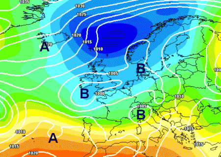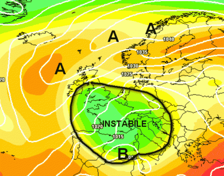 Le alte pressioni resteranno pigre e lontane dalla scena meteorologica mediterranea; una di queste limiterà la sua influenza ai settori centro-meridionali della Penisola Iberica.