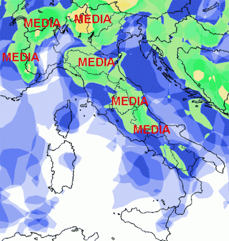Ecco le piogge a macchia di leopardo sull’italia, chiaro segno di una situazione instabile. Notate che gli eventuali rovesci tenderanno a concentrarsi soprattutto nelle aree interne e montuose, risultando meno probabili lungo le pianure e le coste.