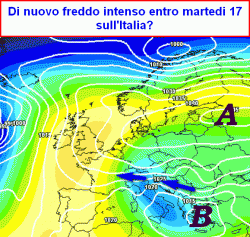 si profila una nuova irruzione fredda da est con neve su medio Adriatico e meridione, qualche sporadica nevicata anche altrove, tanto vento e tanto freddo. Irruzione in affievolimento entro sabato 21. Attendibilità: 55%