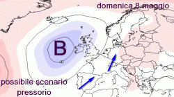 La media degli scenari e anche un’analisi ulteriormente approfondita circa il possibile andamento barico prospetta invece per domenica 8 maggio l’avvicinamento di un vortice depressionario dal nord-ovest del Continente, pronto a spingere aria umida da sud ovest davanti ad un fronte piovoso che potrebbe interessare nord e centrali tirreniche, favorendo invece una rimonta di aria più calda sulle regioni meridionali.