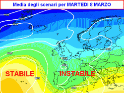 Concentrandoci sulla media degli scenari imbastita questo pomeriggio dal modello americano (in modo da garantire una previsione maggiormente attendibile), si nota per la prima decade di marzo una situazione tutt’altro che stabile.