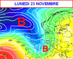 La prima cartina si riferisce alla giornata di domenica 22 novembre. E’ ben evidente l’azione di sfondamento sul Mediterraneo centro-occidentale di una vasta saccatura atlantica a cui si collegherà un sistema frontale.