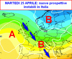 Tra domenica 23 e martedì 25 aprile ecco l’apertura di una nuova fase instabile sull’Italia dettata da correnti fresche di matrice nord occidentale (seconda mappa).