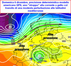 Tale linea di tendenza emerge sia dalla previsione deterministica che dalla media Ensemble del modello americano, laddove quest’ultima tende a "smussare" gli angoli, fornendo nulla più che una panoramica generale, la previsione deterministica lascia invece aperto uno spiraglio di speranza che qualche perturbazione possa infrangere la barriera anticiclonica, apportando qualche nevicata quantomeno sulle nostre Alpi. Nel costituire queste perturbazioni, avremo soltanto una modesta quantità d’aria fredda prelevata dalle latitudini polari, "strappi" della corrente a getto ininfluenti sull’andamento generale della circolazione atmosferica in ambito emisferico, il contesto termico generale continuerebbe a proporre temperature abbastanza miti.