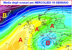 La prima mappa mostra la situazione attesa sul nostro Paese per mercoledì 18 gennaio. E’ una situazione che promette tanta neve al centro e al sud, specie lungo i settori orientali; al nord nessun fenomeno a parte qualche nevicata sull’Emilia Romagna anche lungo le coste.