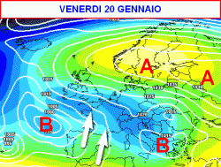 Volgendo lo sguardo a prua e arrivando e venerdì 20 gennaio (seconda mappa), notiamo la scomparsa dell’alta pressione in sede iberica, con i massimi che si posizioneranno sui Golfi di Botnia e Finlandia.