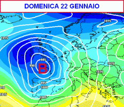 La seconda mappa, valida per domenica 22 gennaio, mostra una situazione favorevole a nevicate più o meno abbondanti al nord, specie sul nord-ovest.