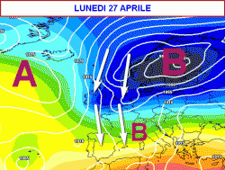 La cartina che vedete poco sopra, valida per la giornata di lunedì 27 aprile, è stata prelevata ad esclusivo scopo didattico, per mostrare quale potrebbe essere il movimento prevalente delle masse d’aria durante l’ultima decade del mese in corso sul nostro Continente.