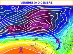 Venerdì 29 dicembre (prima mappa) avremo l’atto conclusivo del peggioramento che tra Santo Stefano e giovedì 28 riporterà la pioggia su molte regioni, unitamente ad abbondanti nevicate sulle zone alpine.