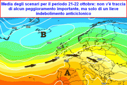 venerdì 20 ottobre (ipotesi perturbata): maltempo al nord, specie su Liguria, Lombardia, basso Piemonte, Prealpi venete, poi Toscana, Umbria ed alto Lazio. Altrove nubi in aumento con qualche pioggia sulla Sardegna. Temperature in netto calo al nord.