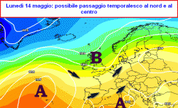 lunedì 14 maggio: passaggio temporalesco possibile tra nord e centro con rovesci in movimento da ovest verso est, specie verso sera, scarsi i riflessi al sud. Temperature in calo.
