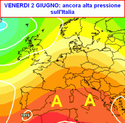 La media degli scenari valida per venerdì 2 giugno mostra l’alta pressione ancora ben salda sull’Italia, dove il tempo sarà nel complesso buono e anche abbastanza caldo.
