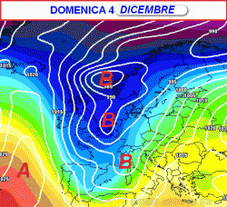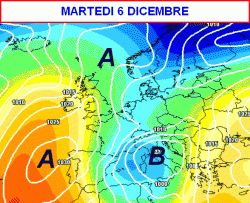 Tra lunedi 5 e martedì 6 dicembre, infine, ecco la depressione in piena azione sull’Italia (terza mappa).
