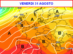 Se con un balzo virtuale ci spostiamo alla fine del mese, notiamo per venerdì 31 agosto un corridoio moderatamente instabile che interesserà gran parte della nostra Penisola e il Continente Europeo.