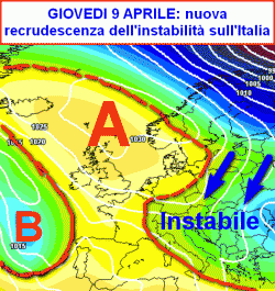 La seconda cartina inquadra la situazione attesa in Italia per giovedì 9 aprile. E’ evidente l’instabilizzazione in area mediterranea ad opera della migrazione dell’anticiclone verso lidi più settentrionali. Questa manovra andrà monitorata nei prossimi giorni, in quanto potrebbe essere la chiave di volta per le vicende meteorologiche future sul nostro Paese.
