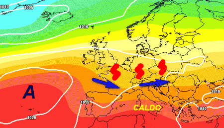 In altre parole, se questa tesi fosse confermata arriverebbero temporali intensi al nord e al centro, con tendenza ad interessare anche parte del meridione con associati cali delle temperature.
