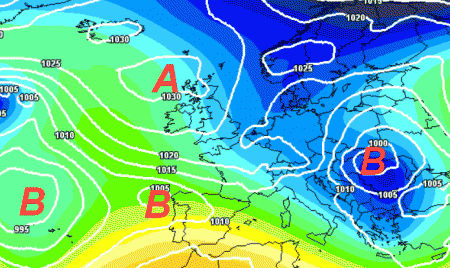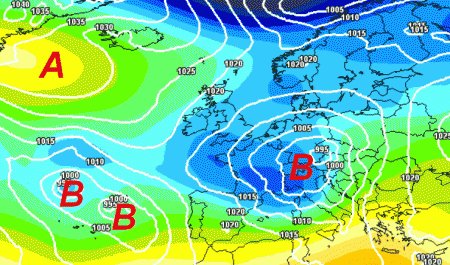 La mappa parla da sola. Guardate dove è piazzata l’alta pressione: addirittura in sede Groenlandese. Tutta l’Europa è preda di condizioni perturbate che fanno capo a diverse depressioni. Quella che ci interesserà risulterà posizionata sul nord Italia.