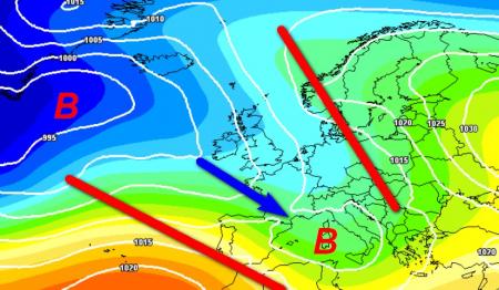 Un autentico CANALE DEPRESSIONARIO che si diparte tra due zone di alta pressione poste ai lati: la prima in sede russa e la seconda in Atlantico.