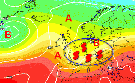 Ecco il "nido" di temporali che dall’Europa centrale potrebbe estendersi in agilità verso le regioni settentrionali e centrali italiane con tendenza ad interessare anche il sud. Se questa tesi fosse confermata, si potrebbe etichettare questo episodio come "Rottura estiva" o "Burrasca di Ferragosto".