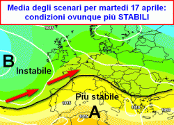 La media degli scenari valida per martedì 17 aprile mostra una rimonta dell’alta pressione sul Mediterraneo e sull’Italia, con tutte le perturbazioni che verranno deviate verso l’Europa centro-settentrionale (frecce rosse).