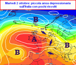 martedì 2 ottobre: piccola ansa depressionaria sull’Italia con moderata variabilità e qualche modesto fenomeno, specie in Appennino. Temperature miti.