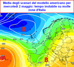 Si nota per mercoledi 2 maggio (prima mappa) un quadro meteorologico complessivamente instabile su gran parte dello Stivale, specie al nord, sulla Sardegna e al centro.