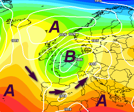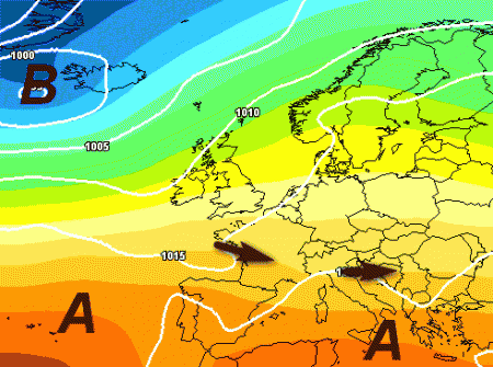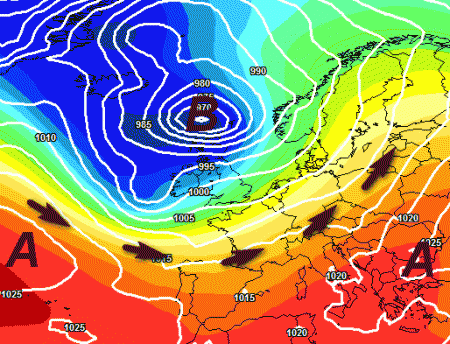 Meno evidente appare l’inserimento del ramo ascendente della saccatura in altre mappe, ma l’impianto barico rimane pressoché simile, come si evince qui sotto: