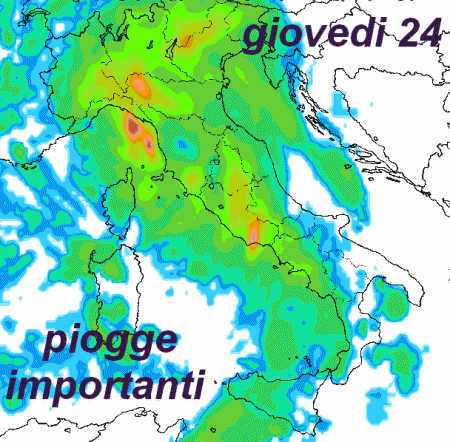 –peggioramento probabile (65%) su gran parte del Paese a partire dal nord e dal Tirreno entro mercoledì 23 o al massimo giovedì 24, piogge più intense al nord e sulle centrali tirreniche ma temporali marittimi non trascurabili anche intorno alla Sardegna. Calo termico nelle aree raggiunte dai fenomeni.