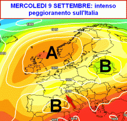 La prima cartina che vi presentiamo è molto eloquente e ci mostra la previsione per mercoledì 9 settembre in Europa e in Italia.