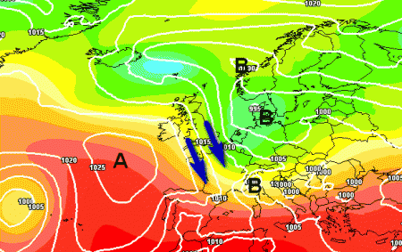 L’alta pressione sull’Italia verrebbe praticamente annientata da correnti fresche nord atlantiche. L’impatto dell’aria fresca su un mare fortamente surriscaldato darebbe vita a contrasti accesi con temporali anche forti in marcia da nord a sud.