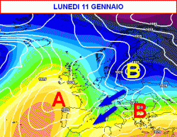 Volgendo ulteriormente lo sguardo a prua, un nuovo tentativo di blocco delle correnti zonali è atteso per lunedì 11 gennaio (seconda figura a lato).
