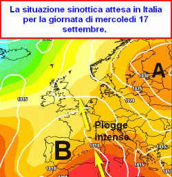 La cartina di previsione valida per la giornata di mercoledi 17 settembre contempla proprio lo scenario sopra descritto. Se così fosse, si attiverebbe un canale sciroccale molto umido che dal nord Africa investirebbe in pieno le regioni settentrionali, segnatamente il nord-ovest.