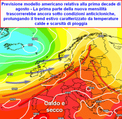 Per il Mediterraneo uno scarso tiraggio delle correnti oceaniche può essere tradotto in un proseguimento della stagione estiva anche nel mese di agosto, senza troppi intoppi almeno per quanto concerne la sua prima metà. Temperature elevate soprattutto al meridione, farebbe caldo anche al nord ma con più moderazione. L’instabilità relegata soltanto alle zone interne e montuose mentre sarebbero scarsi o nulli i passaggi instabili organizzati.