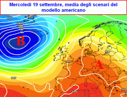 All’inizio della settimana prossima (la prima mappa è valida per mercoledi 19 settembre) l’alta pressione verrà messa un po’ alle strette da una vasta circolazione ciclonica fredda presente sul nord Atlantico.