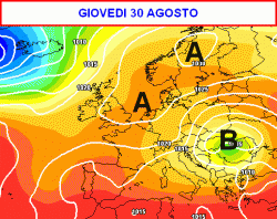 La mappa relativa a giovedì 30 agosto mostra inoltre un tentativo di rinforzo anticiclonico in sede scandinava e un corridoio instabile a minore resistenza ubicato sull’Europa occidentale.