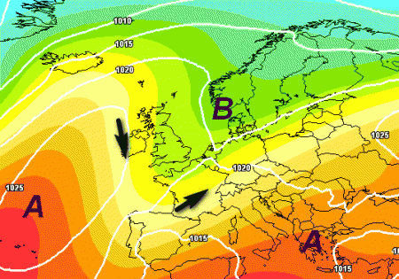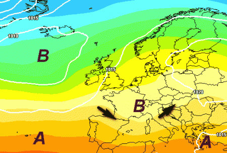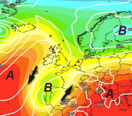 Tuttavia persistono alcuni dubbi, perché le emissioni ufficiali dei rispettivi modelli propongono anche una versione alternativa a questo schema barico: un affondo più soffocato sull’Iberia, con difficoltà del vortice nell’avanzamento verso est e l’inevitabile richiamo di una massa d’aria calda "di rimbalzo" sulla nostra Penisola, con una nuova parentesi estiva, soprattutto al centro e al sud, come mostra la mappa seguente: